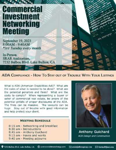 Commercial & Investment Networking (Other) 8am-9:40am | Location: 7232 Balboa Blvd., Van Nuys, CA 91406 Room: Auditorium (Rm #1) Type: Other Cost: Free