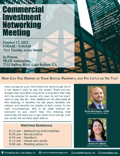 Commercial & Investment Networking (Other) 8am-9:40am | Location: 7232 Balboa Blvd., Van Nuys, CA 91406 Room: Auditorium (Rm #1) Type: Other Cost: Free