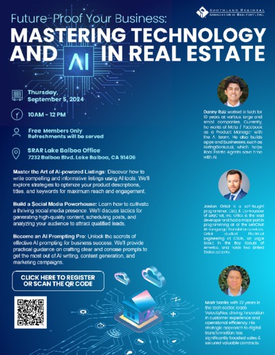 Future Proof Your Business: Mastering Technology and AI in Real Estate (Lecture) 10am-12pm | Location: 7232 Balboa Blvd., Van Nuys, CA 91406 Room: Auditorium (Rm #1) Type: Lecture Cost: Free